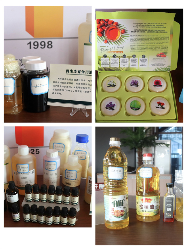 李玉成(右三)、毛任建(左三)查看棕榈油加工成品的样品。