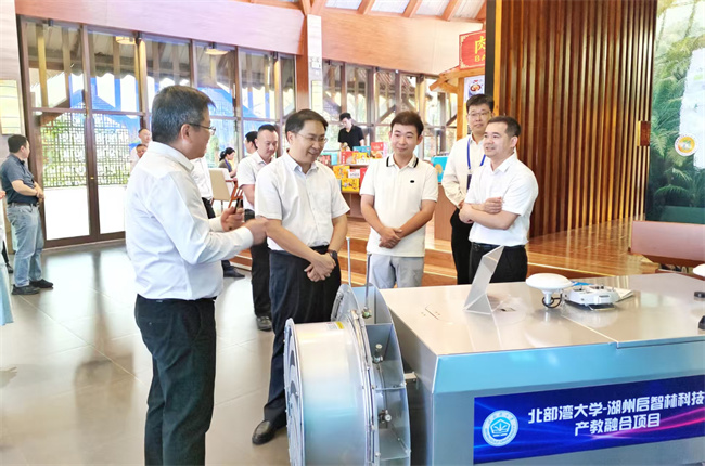 ▲李玉成(前左二)了解北部湾大学湖州启智林科技产教融合项目情况。