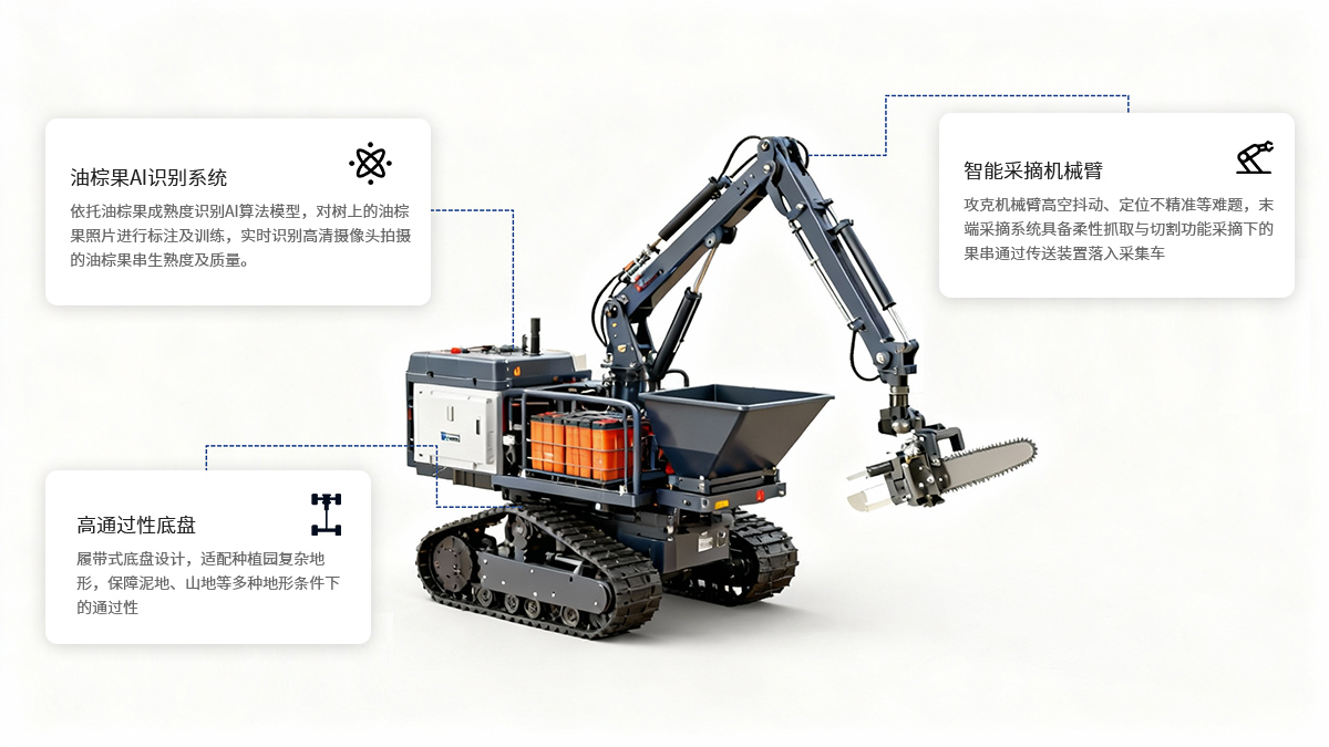 智能高效油棕果采收机器人,配备AI视觉识别系统,实现精准高效采收作业。